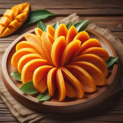 Підготовка: Манго миють, очищають від шкірки та нарізають на тонкі шматочки.