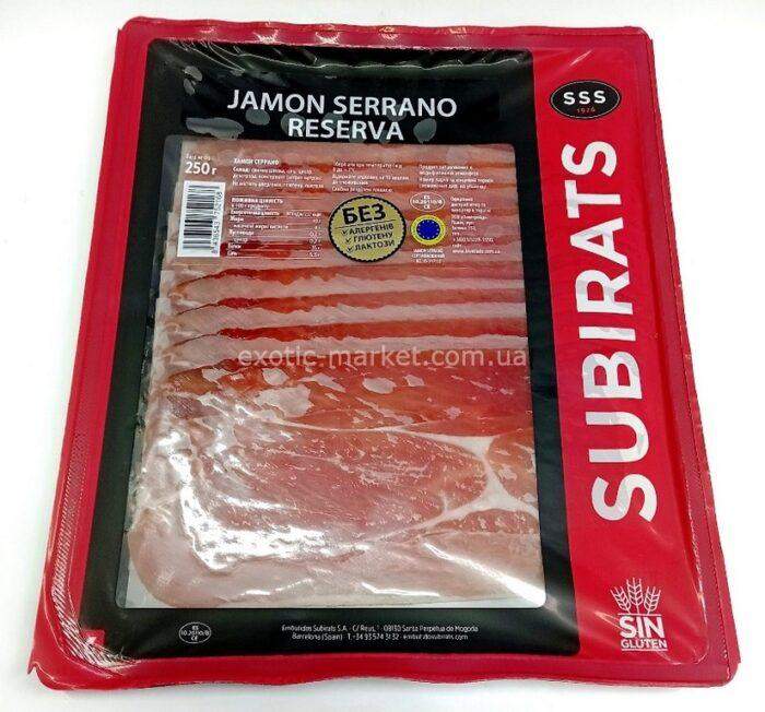 Хамон Subirats Jamon Serrano – дуже ніжний та унікальний продукт від відомого в Іспанії та далеко за її межами торгового бренду Subirats. Продукт має незвичайний аромат, незвичайну структуру та витончений смак. Для м’якоті хамону характерний особливий бордовий колір із легким коричневим відтінком. Також на його поверхні видно жирові прожилки світлого кольору. Перед процесом виготовлення м’ясо засипають сіллю у великій кількості, щоб висушити та зневодити. Як правило, процес триває від 6 до 36 місяців. Після цього хамон розташовують у прохолодних приміщеннях, де за температури 8 – 10 градусів м’ясо велиться протягом 9 – 12 місяців. Саме завдяки такому терміну та натуральним компонентам хамон має характерний смак та незвичайний аромат.