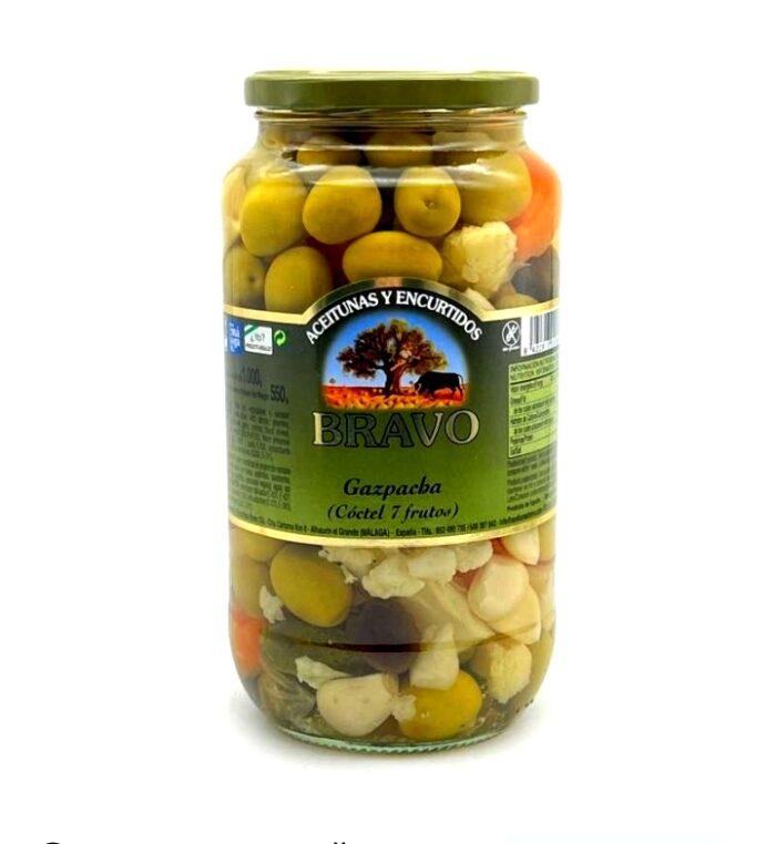Цей продукт ідеальний, бо адаптований під будь-який смак. Іспанські зелені оливки Bravo Gazpacha маринуються одночасно з маслинами, часником, морквою, цибулею, солоними огірками і цвітною капустою.