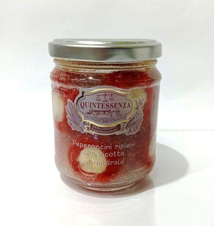 Перець Quintessenza peperoncini ripieni con Ricotta al naturale. Смачний, гострий перчик, начинений сиром – традиційне блюдо, дуже популярний в Південній Італії. Для його приготування відбирають круглі перчики Peperoncini, видаляють насіння і плодоніжки, потім відварюють у воді з оцтом. Перці фарширують сиром і заливають маринадом. Продукт має приємний, пікантний смак і яскравим ароматом. Перець Quintessenza готовий до вживання в якості самостійної закуски, також він відмінно підходить для приготування брускетта.