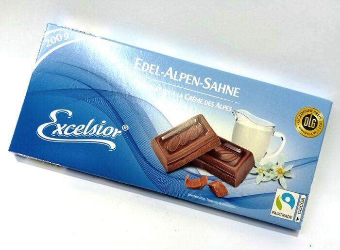 Шоколад Excelsior молочний – це класичний молочний німецький шоколад, альпійський крем. Альпійське молоко та вершки, тщательно відібрані сорти какао роблять Excelsior неперевершеним шоколадом.